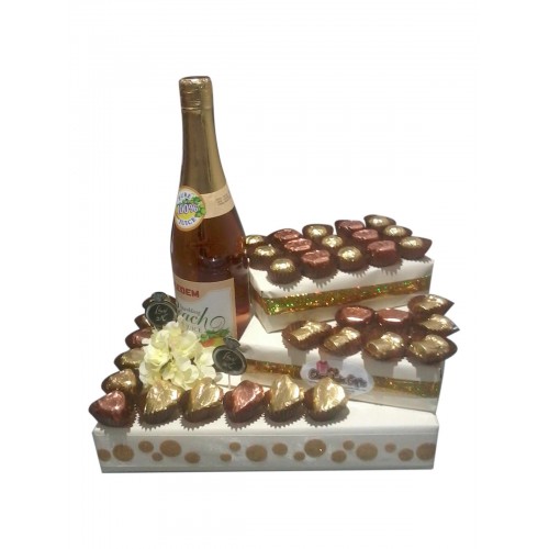 This fantastic arrangement will look gorgeous at any Simcha. Contains a large sparkling grape juice and an assortment of deliciously filled truffles. It is sure to make someones day!
