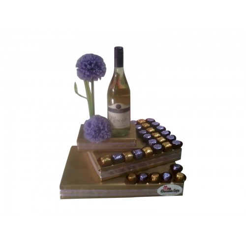 This fantastic gold and lilac arrangement will wow anyone! Theres a great selection of fine praline chocolates together with a tasty wine. The perfect wanted gift for any occasion!