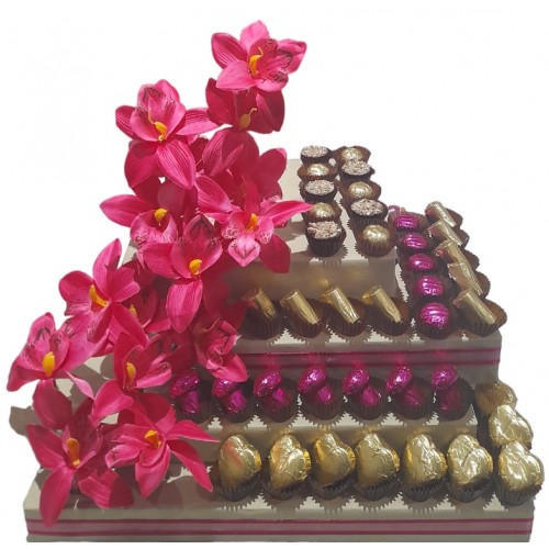 A lovely brightpink arrangement for that darling princess, embellished with the finest Belgian chocolates. Also available in any other colour