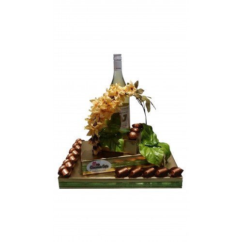 This massive presentation is sure to make a statement and any event. Luscious layers filled with mouth-watering chocolates and truffles together with a bottle of wine. What could be a better treat?