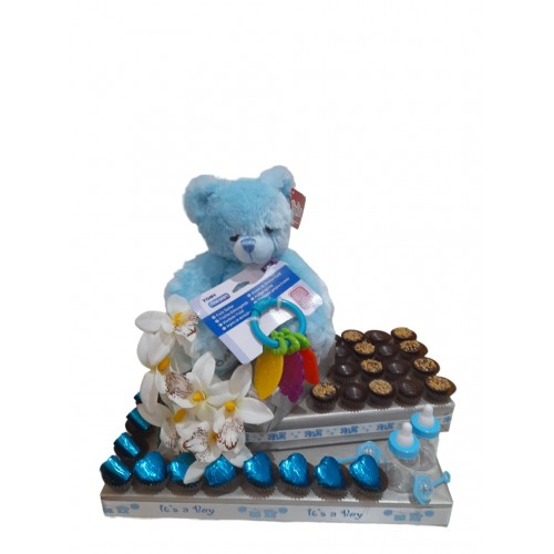 Four luxurious layers featuring a dazzling display of deliciously rich and creamy chocolates will surely entice all the family. Delicately decorated with blue ribbon and faux florals, and a big teddy on the top, this arrangement delights all the senses.