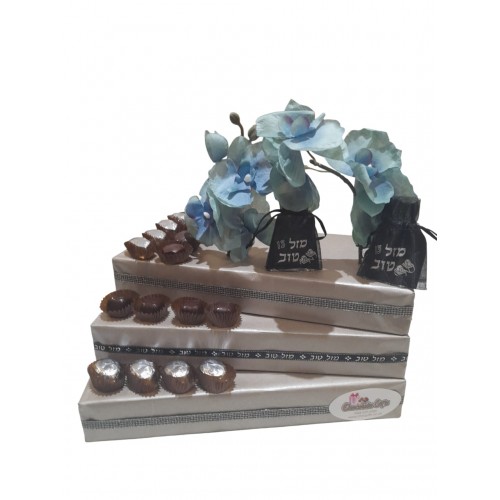 This multi-leveled arrangement is the perfect centerpiece. A selection of fine Belgian pralines chocolates together with Bar Mitzva embellishments and orchids makes it a great gift!