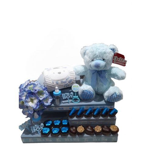 This beautiful baby boy arrangement will delight everyone. Gorgeous baby embellishments together with heavely wrapped chocolates for the family, elegantly decorated with ribbons, this arrangement will be a giant delight for the new family! Included is a gorgeous babygro and plush Teddy bear.