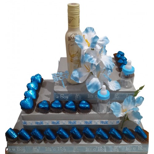 The entire family will celebrate the arrival of a sweet baby boy with this arrangement. A delightful selection of chocolates and a small bottle of Walders for everybody.