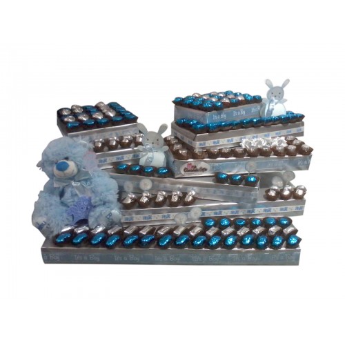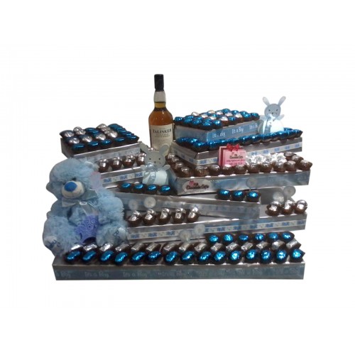 Surprise everyone by sending this stunning layered chocolate arrangement. Layers galore filled with delicious chocolates, this will be a hit at any Sholom Zocher. Also included is a cute plush teddy for the baby. Option to have a whiskey added - please call for prices 0161 239 3939