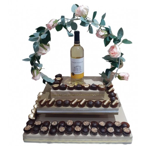 Price stated is for the arrangement with a wine. Sparkling grape juices, wines and liquors are available upon request and are charged accordingly. Ideal for shalach manos and all year round. Chocolates are under the hashgocho of Machsikie Hadas of Antwerp.