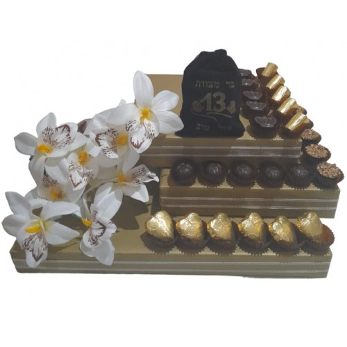Celebrate a Bar Mitzva with this charming tefillin chocolate arrangement.Two layers of delicious filled chocolates are delicately foil wrapped. This arrangement will please everyone