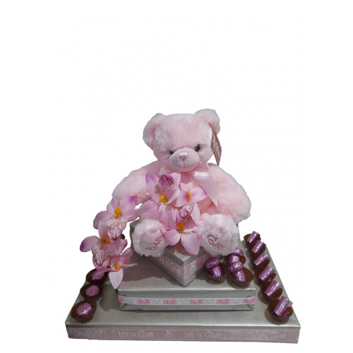 A lovely little baby pink arrangement for that darling princess, including a gorgeous teddy, embellished with the finest Belgian chocolates. Also available in blue for that special prince
