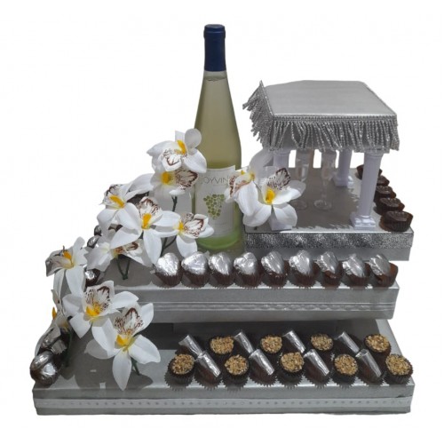 This gorgeous presentation will be a delight to any new couple. A triple layer of elegant creamy chocolates is topped by a beautiful miniature Chuppah. Embellished with beautiful artificial flowers and satin ribbons, this arrangement will make a great centrepiece! Colours can be changed to match a specific colour scheme. Call us now on 0161 239 3939
