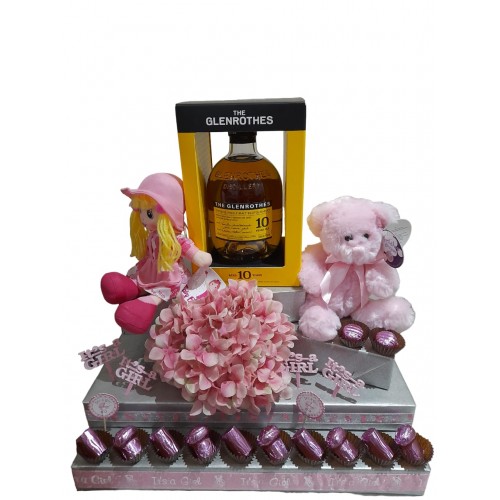 Indulge any new mother with the delightful and magnificent presentation. A selection of mouth watering chocolates will bring joy together with a soft plush teddy and soft doll on top. Please call before ordering to make sure we have all the baby items in stock. Also option for baby boy. Call us on 0161 239 3939