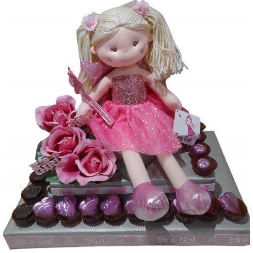 Celebrate the birth of a bouncing baby girl with some much needed goodies for parents and a cuddly toy for the baby too. With all pink ribbons and wrappings, a pink soft doll,and a fantastic selection of fine Belgium pralines