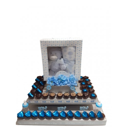 This charming arrangement makes the perfect gift for the new mother. A cute and cuddly teddy bear and blanket set sits near a delightful layer of delicately smooth chocolates. A wonderfully sweet arrangement for a wonderfully sweet occasion