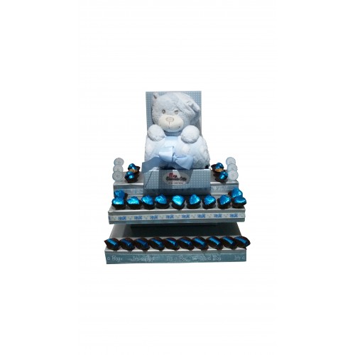Luxurious layers featuring a dazzling display of deliciously rich and creamy chocolates will surely entice all the family. Delicately decorated with blue ribbon,and a big teddy and blanket on the top, this arrangement delights all the senses