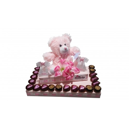 This glittering teddy platform will help welcome that pretty princess. Can also be made for a baby boy. All of our arrangements come elegantly wrapped in cellophane and dont forget - we offer free local delivery!