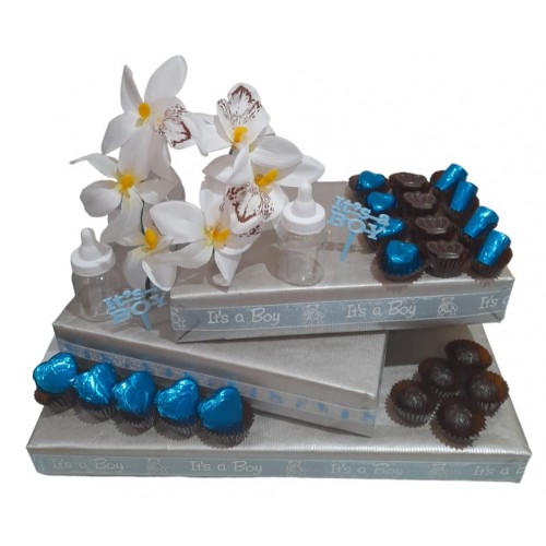 Gorgeous baby arrangement filled with delicious Belgian chocolates. Decorated with beautiful flowers, this gift will make anyone happy.