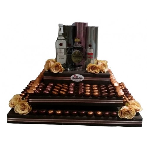 This massive and magnificent chocolate arrangement is sure to make anyones day. With nearly an assortment of fine Belgium pralines beautifully wrapped and 4 bottles of kirsch, you definitely cant go wrong sending this. Embellished with beautiful artificial flowers and fancy ribbons.