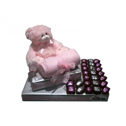 Indulge any new mother with the delightful presentation. A selection of mouth watering chocolates will bring joy together with a soft plush teddy holding a rolled up blanket.