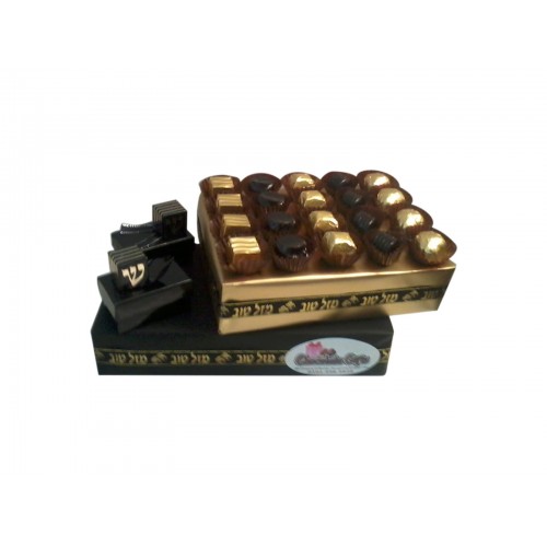 This beautiful Gold and black arrangement on 3 layers looks tall and classy. Contains delicious choc..